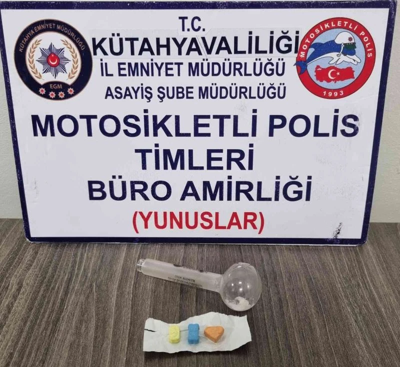 Kütahya’da Motosikletli Polis Timlerince durdurulan araçta bulunan 3 kişiden birinin Uyuşturucu Madde Ticareti Yapma suçundan arandığı tespit edilirken, yapılan aramada, 3 adet extasy hap ve 1 adet payp ele geçirildi.