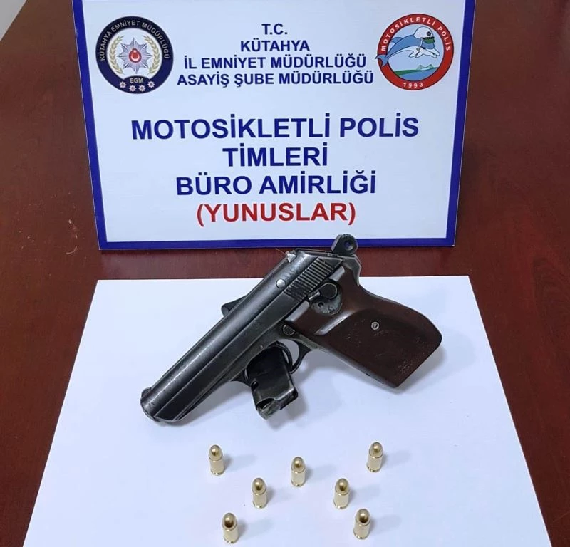 Kütahya’da motosikletli polis timlerince durdurulan araçta yapılan aramada, 1 adet ruhsatsız tabanca ve 7 adet fişek ele geçirildi.