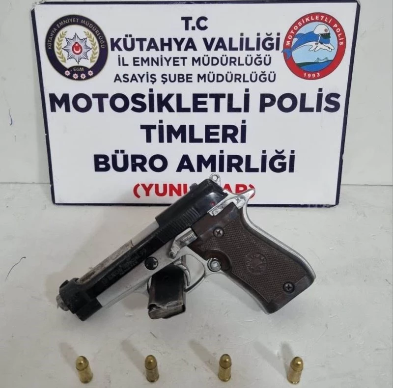 Kütahya’da Motosikletli Polis Timlerince bir kişinin yapılan üst aramasında, ruhsatsız tabanca ve 4 fişek ele geçirildi.