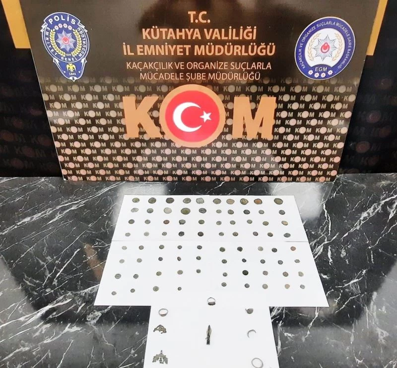 İl Emniyet Müdürlüğü Kaçakçılık ve Organize Suçlarla Mücadele Şube Müdürlüğü ekiplerince tarihi eser kaçakçılığı suçunun önlenmesine yönelik olarak yapılan çalışmalar kapsamında Kütahya-Afyon PTS noktasında durumundan şüphelenilerek durdurulan otomobilde yapılan aramada, bir poşet içerisinde 79 adet faklı boy ve ebatlarda sikke, 1 adet ok ucu, 3 adet yüzük, 2 adet yüzük parçası, 2 adet obje olmak üzere toplamda 87 adet tarihi eser olarak değerlendirilen parçalar ele geçirildi.