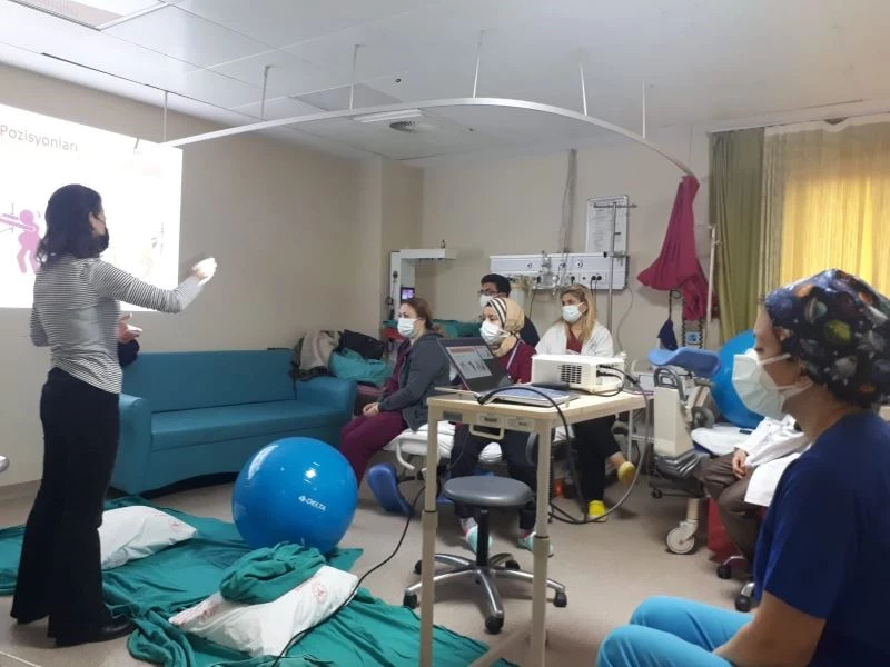 Ebelik AD’den Dr. Öğr. Üyesi Ayşegül Unutkan tarafından verilen eğitime, Kadın Hastalıkları ve Doğum AD Öğretim Üyesi Prof. Dr. Yasemin Taşçı ve ebeler katıldı. Eğitimde ‘Anne Dostu Hastane’ uygulamaları çerçevesinde önerilen aktif pozisyonların kullanımı uygulamalı olarak anlatıldı.