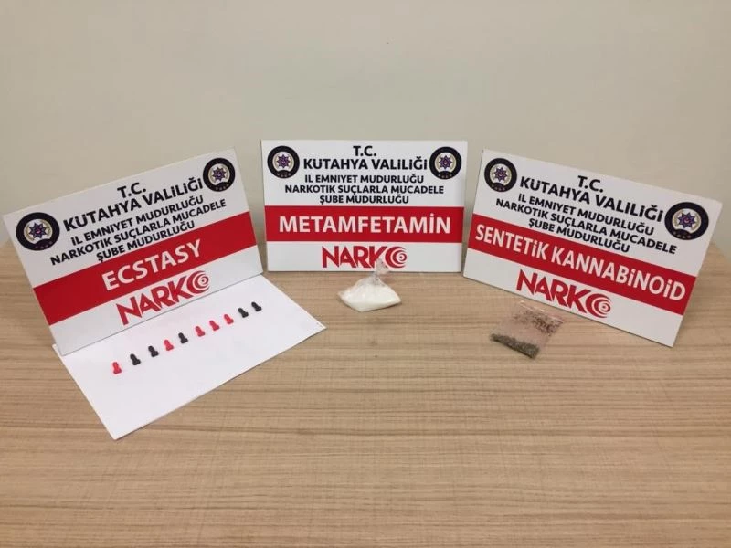 İl Emniyet Müdürlüğü Narkotik Suçlarla Mücadele Şube Müdürlüğü görevlilerince yapılan çalışmalar çerçevesinde il dışından Kütahya’ya uyuşturucu madde getireceği şeklinde bilgiler elde edildi. Plakası belirlenen ve içerisinde S. Ş, K. T ve M. A isimli şüphelilerin bulunduğu araç il girişinde durduruldu. Araçta ve şahısların üzerinde yapılan aramada, 25.24 gram metamfetamin, 1.09 gram bonzai maddesi ve 10 adet ecstasy hap ele geçirildi.