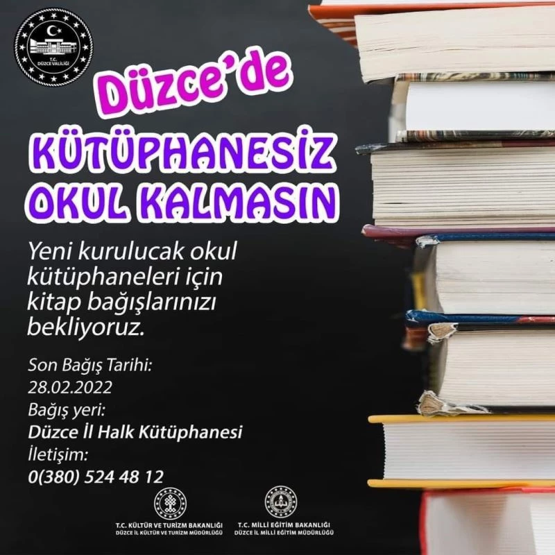 Milli Eğitim Bakanlığı ülke genelinde kütüphanesiz okul kalmasın projesini başlatarak ülke genelinde okullara kütüphane oluşturmaya başladı. Kültür ve Turizm Bakanlığı’da kütüphanelere kitap ulaştırmak için kolları sıvadı. Ülke genelinde bir çok noktada bulunan okullara kitaplar bağışlanırken, Düzce Kültür ve Turizm Müdürlüğü’de kitap toplama kampanyası başlattı. Yeni kurulacak okul kütüphaneleri için kitap bağışlarını beklenirken, toplanacak kitaplar Düzce İl Halk Kütüphanesi’ne ulaştırılacak. Kampanyaya son bağış tarihi ise 28 Şubat 2022 olarak belirlendi.
