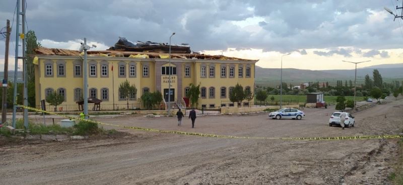 Sivas’ın Gemerek ilçesinde etkili olan kuvvetli rüzgar adalet sarayının çatısını uçurdu.