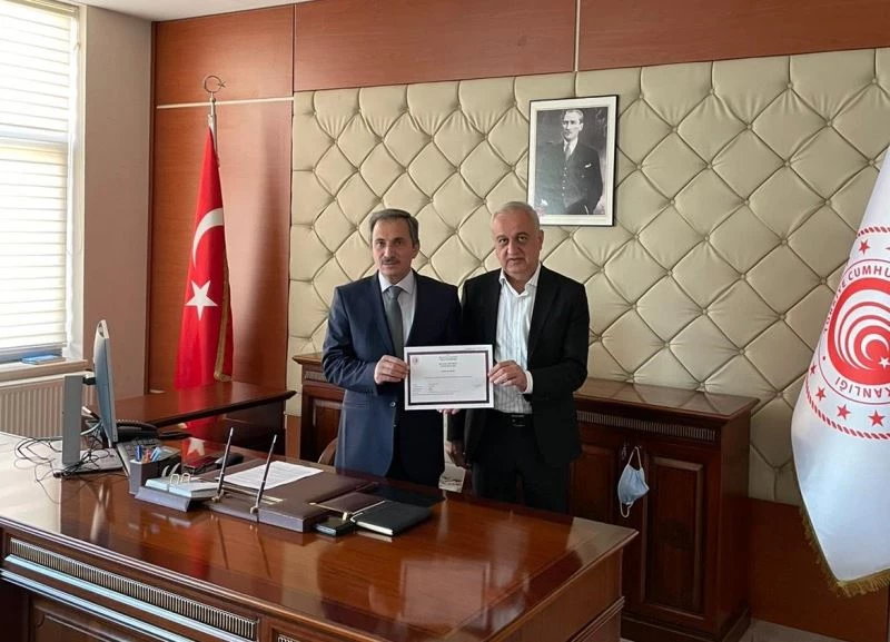 Malatya Ticaret İl Müdürü Ahmet Demirbağ, Malatya’da 1 Nolu Kuyumcu Yetki Belgesini Malatya Kuyumcular Odası Başkanı Murat Özhüsrev’e verdi.