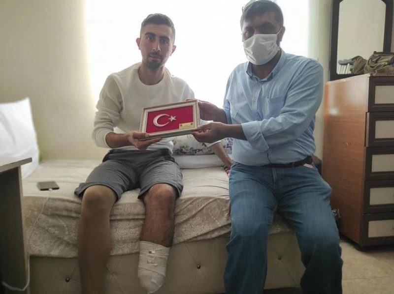 Sol ayağını kaybeden Piyade Uzman Onbaşı Bahri Oktay Kurt’u Kahramanmaraş Şehit ve Gazi Aileleri Derneği Başkanı Yunus Karaman evinde ziyaret ederek filografi sanatı ile yapılan Türk Bayrağı’nı hediye etti.