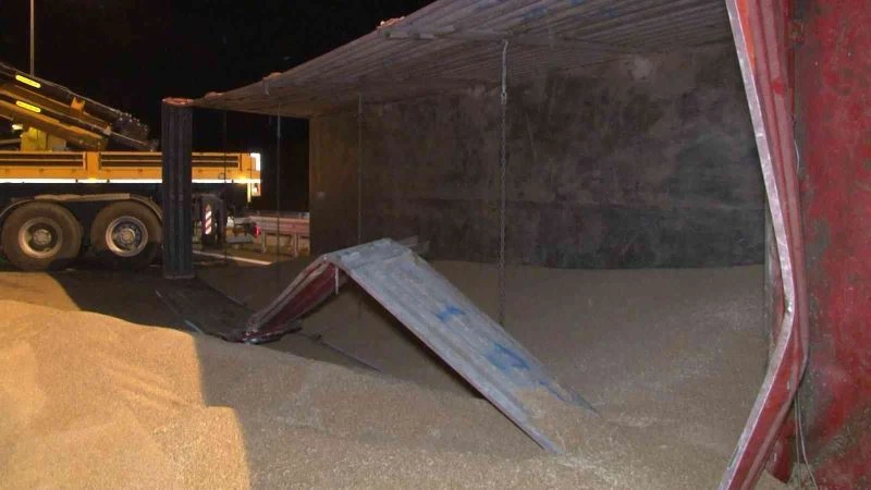 Kuzey Marmara Otoyolu’nda buğday yüklü tır devrildi: 2 yaralı