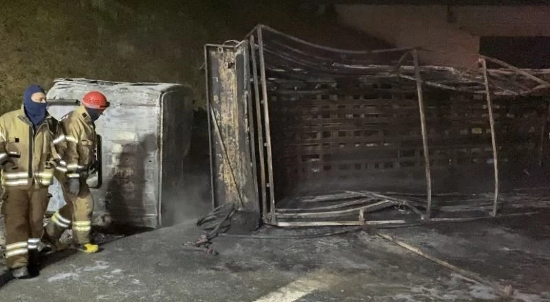 Kuzey Marmara Otoyolunda bir kamyon, sürücüsünün kontrolünü kaybetmesiyle yol kenarında bulunan menfeze çarparak yan yattı. Devrilen kamyon alev alarak hurdaya dönerken kamyon şoförü yanarak can verdi.