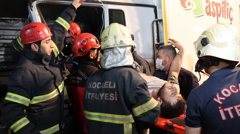 Kocaeli’nin İzmit ilçesi Kuzey Marmara Otoyolu’nda çarptığı tırın dorsesi ile kullandığı kamyonun kasası arasında sıkışan sürücü, itfaiye ekiplerinin yarım saat süren müdahalesi ile kurtarıldı. Yaralı sürücü hastaneye kaldırılırken, kamyonun hız göstergesinin saatte 100 kilometrede takılı kaldığı görüldü.