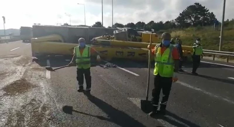Kuzey Marmara Otoyolu’nda kontrolden çıkan vinç devrildi:1 yaralı