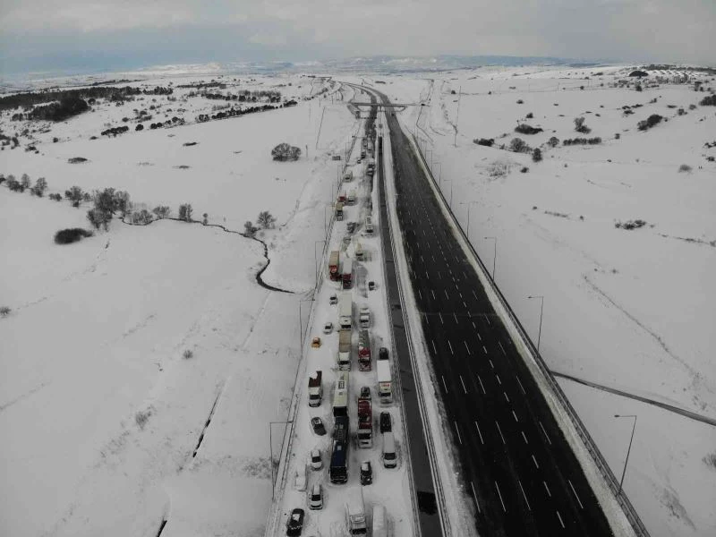 Kuzey Marmara Otoyolu’nda mahsur kalan onlarca tır drone ile görüntülendi