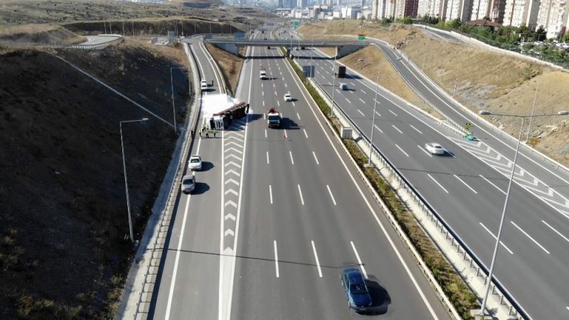 Kaza yapan tır vinç yardımıyla kaldırılırken yola saçılan plastik hammaddeleri de ekipler tarafından toplanarak yol temizlendi.