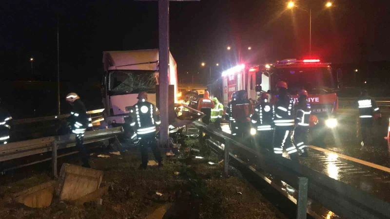 Kaza, Kuzey Marmara Otoyolu İzmit geçişi, İstanbul istikameti İzmit Kuzey gişelerine giden yol ayrımında meydana geldi. Edinilen bilgiye göre, E.T. idaresindeki 06 EC 327 dorse plakalı tır, yağmurun da etkisiyle kontrolden çıktı. İzmit Kuzey gişelerine giden yol ayrımında tır, tabela direğine çarparak durabildi. Çarpmanın etkisiyle sürücü tırın içerisinde sıkışırken aracın ön tarafında ağır hasar meydana geldi. Kazanın 112 Acil Çağrı Merkezine bildirilmesi üzerine bölgeye itfaiye, sağlık ve jandarma ekipleri sevk edildi. Sıkışan sürücü Kocaeli Büyükşehir İtfaiyesi ekiplerinin müdahalesiyle tırdan çıkarıldı. Sağlık ekiplerine teslim edilen E.T.’ye ambulansta ilk müdahale uygulandı, ardından Kocaeli Şehir Hastanesine kaldırıldı. Jandarma ekipleri muhtemel yeni bir kazanın önüne geçmek adına yolda geniş güvenlik önlemleri aldı.