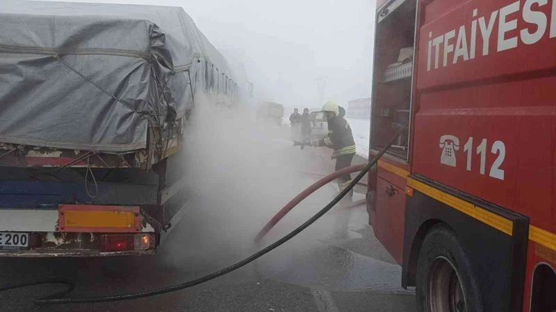 Lastiği alev alan tır itfaiye ekiplerince söndürüldü