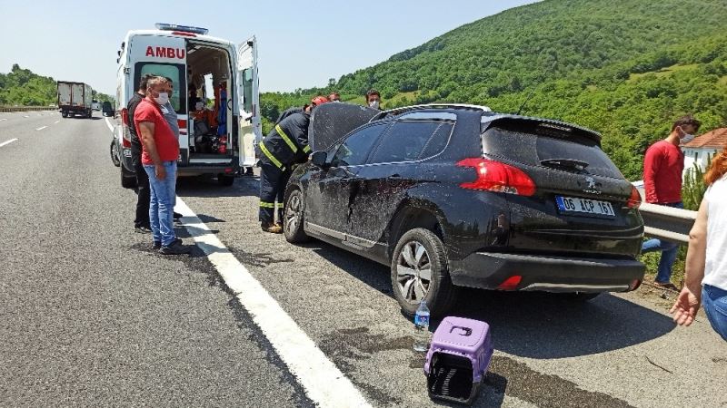 DÜZCE(İHA) – Ankara istikametinden İstanbul İstikametine gitmekte olan otomobil, TEM Otoyolu Gümüşova rampaları mevkiinde ön lastiğinin çıkması sonucu bariyerlere çarptı. Kazada 4 kişi yaralandı. Otomobilden yaralı olarak kurtarılan genç kız ise ambulansa bindirilirken kedisinden ayrılmadı. Acil sağlık ekipleri acı çeken genç kızın tedavisini kucağındaki kedi ile birlikte yaptı.