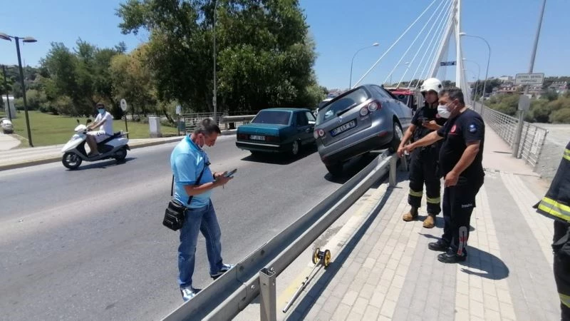 Antalya’da köprü girişinde lastiği patlayarak bariyere çıkan otomobil 40 metre bariyer üzerinde gittikten sonra askıda kaldı. Sürücünün bile nasıl olduğunu anlayamadığı olayı, olay yerine gelen itfaiye ekipleri de çözmekte zorlandı.