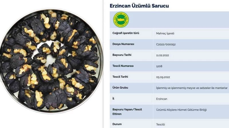 Erzincan’ın Üzümlü ilçesinde yetişen ve kentin tescilli ürünlerinden olan Cimin üzümü ile cevizin muhteşem birlikteliğinden oluşan ve kış aylarında sohbetlerin vazgeçilmezi olan yöresel lezzet saruc, marka kurumunca onaylanarak tescillendi.