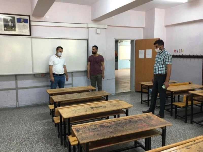 Korona virüs salgınıyla mücadele kapsamında okullarda hazırlanan sınav salonlarında gerekli tedbirler alınarak uygun hale getiriliyor.