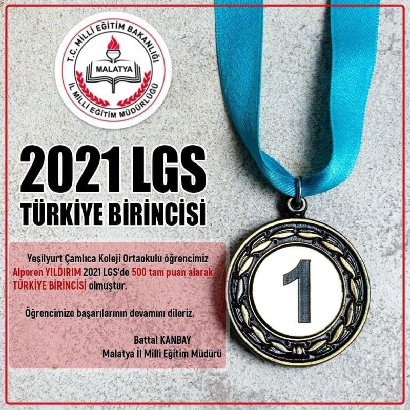 Malatya Çamlıca Koleji ortaokulu öğrencisi Alperen Yıldırım tüm soruları doğru cevaplayarak 500 tam puan aldı ve Türkiye birincileri arasında yer aldı.