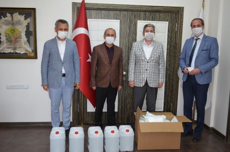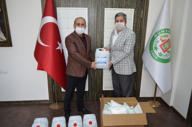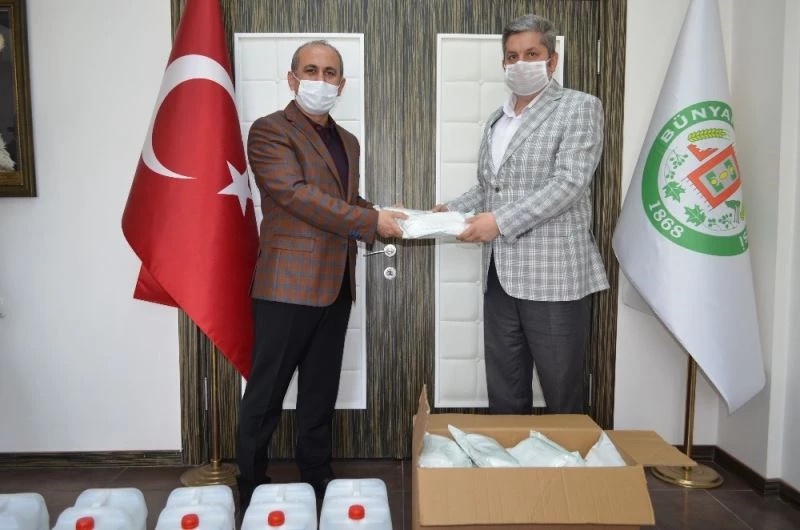 Bünyan Belediye Başkanı Özkan Altun, çocukları için hazırlanan maske ve dezenfektanları İlçe Milli Eğitim Müdürü Serdal Çelik’e teslim etti.