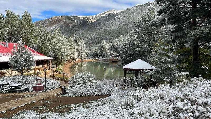 Gümüşhane’de Zigana Dağının eteklerine denizden 2 bin 24 metre yükseklikteki Limni Gölü Tabiat Parkında güneş beyaz örtünün üzerine doğdu. Bölgedeki ağaçlar ve binaların üzeri beyaz örtüyle kaplandı.