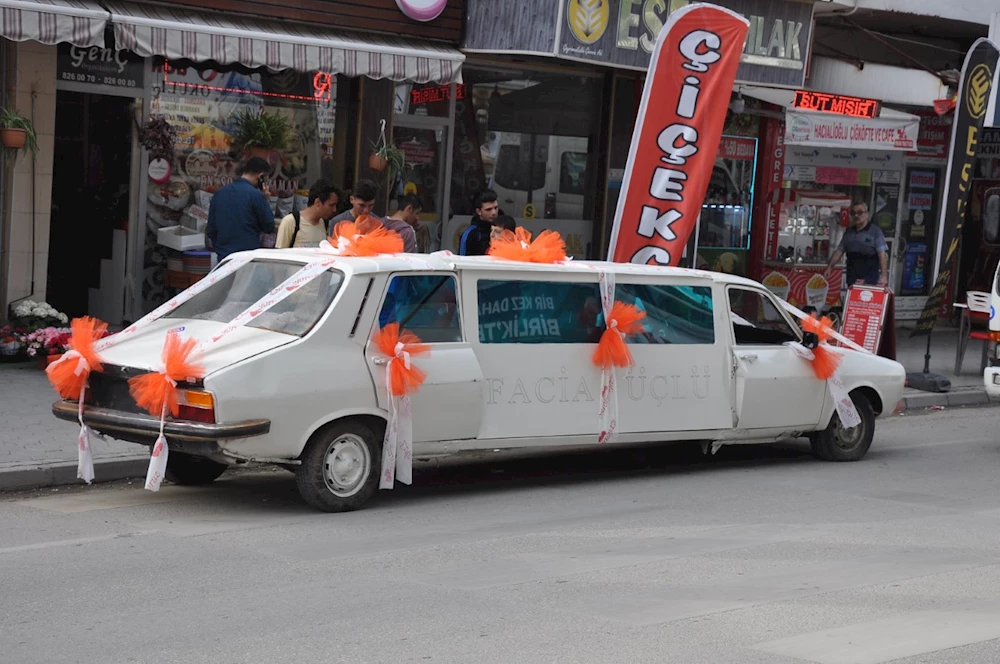 Osmaniye`de limuzin görünümlü toros, gelin arabası oldu ancak, trafikte gitmesine izin verilmeyince yüklendiği çekicide süslendi. Gelin ve damadın bindiği otomobil çekici üzerinde şehir tutu yaptıktan sonra düğün salonuna gitti. Damat Mami Emen, düğününde gelin arabası olarak kullanmak üzere arkadaşıyla birlikte 1978 model bir otomobili ikiye bölüp demir profille uzatarak limuzine çevirdi. Düğün günü araç süslenmek üzere çiçekçi önüne götürüldüğünde, trafik ekipleri aracın bu şekilde karayollarında gitmesine izin veremeyeceklerini belirttiler. Hayalini gerçekleştirmekte ısrarlı olan damat Mami Emen bu sefer aracı çekici üzerine yükletip, gelini o şekilde düğün salonuna götürdü. Emen, 3 bin 500 liraya satın aldıkları Renault 12 aracı, yapacağı düğünde, hayalindeki limuzini o tarihte uygun fiyata temin edemeyeceğini bunun üzerine limuzin yapmaya karar verdiklerini belirterek, "Baktık limuzinin kirası çok yüksek ve biz neden yapmayalım diye karar verdik. İsmini söyleyemesek de Limuziminimizi kendimiz yaptık. Her şeyin bir güzelliği vardı, aracımızın trafikte gitmesine izin verilmedi. Gelin yerde her zaman gider ama Çekicinin üzerinde gitmenin bir çekiciliği olur en azından." dedi. Gelinin Eylem Emen`in araçtan haberinin olmadığını belirten Mami Emen, "Aracı görünce çok şaşırdı, halen şaşkın ve araca bindiği zaman o şaşkınlığını herhalde atacak." şeklinde konuştu. Damadın arkadaşı Sefa Kındır ise Türkiye`de bir ilke imza attıklarını belirterek, "Bugün sadece bir limuzin yaparak değil, aynı zamanda bir çekiciyi süslettik. Daha önce bir çekiciyi süsletip düğün yapan olmamış, biz duymadık. Üç tane gelin arabamız oldu, bir tane normal aracımız, bir çekicimiz ve limuzinimiz var. Üç tane gelin aracıyla düğün yapan tek damat oldu arkadaşımız." diye konuştu. Çekici üzerindeki limuzin görünümlü araca binen gelin Eylem Emen ise "Çok güzel olmuş, benim haberim yoktu ve çok güzel bir sürpriz oldu. Değişik bir anı oldu bizim için." diye konuştu. Çevrede izleyen vatandaşlar ise bu ilginç görüntüyü cep telefonu kameralarıyla kaydettiler.