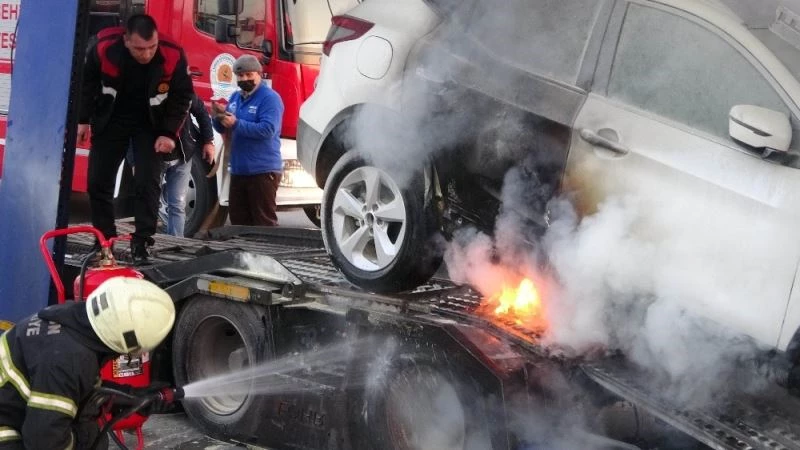 Samsun’da fabrikadan bayilere sıfır araç taşıyan tırda yangın çıktı. Yangına vatandaşlar anında müdahale edince, tır ve üzerindeki 7 otomobil yanmaktan son anda kurtarıldı.