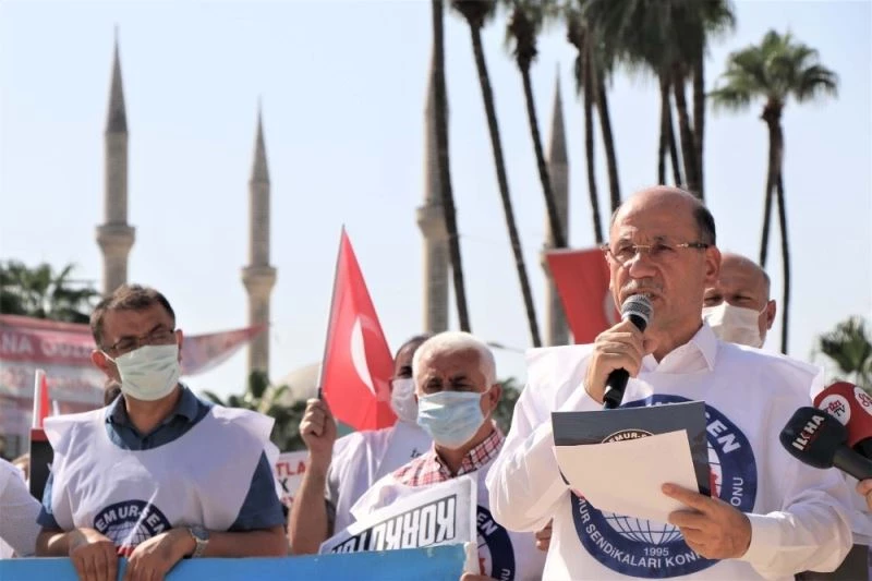 Memur-Sen Adana İl Temsilcisi Mehmet Sezer’in İstasyon Meydanında yaptığı basın açıklamasına Memur-Sen’e bağlı sendikaların şube başkanları, STK yönetici ve gönüllüleri ile çok sayıda vatandaş katıldı.