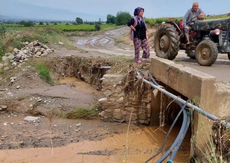 Manisa’nın Sarıgöl ilçesi Tekeliler Mahallesinden geçen Çınarlı Dere üzerine 10 yıl öncesi DSİ tarafından yaptırılan tek gözlü köprü geçtiğimiz gün yağan şiddetli yağmurlardan oluşan sel sularını almayınca köprüden taşan sel suları çevrede bulunan üzüm bağlarına zarar verirken, mahallenin de çevreyle olan ulaşımını olumsuz etkiledi.