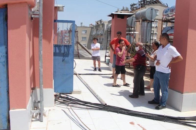 Antalya’da bir binanın çatısından baz istasyonunun kablolarını çalmaya çalışan hırsız, fark edilince mahalleliyi sokağa döktü.