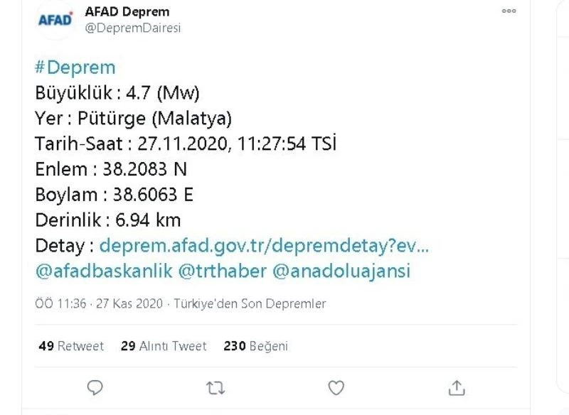 AFAD sosyal medya hesabından, "Büyüklük 4.7, Pütürge Malatya, 11:27" açıklamasında bulunuldu. Vatandaşlar kendilerini sokaklara atarken, deprem çevre illerden de hissedildi. Deprem anında kendilerini sokağa attıklarını ifade eden vatandaşlar, korkmadıklarını, bu duruma alıştıklarını söyledi.