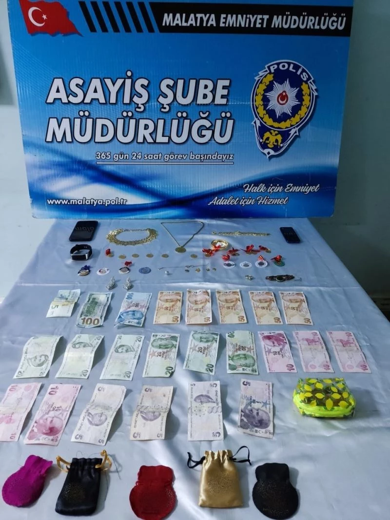 Şüpheli L.S, tahkikat için Malatya’ya getirildi. Şahsın yapılan üst aramasında 1 adet bilezik, 5 adet yarım altın,7 adet çeyrek altın,8 adet gr altın,1 adet bakır renkli bileklik, 4 adet altın kolye ucu, 1 adet küpe, 1 çift küpe, 1 adet altı taşlı yüzük, 1 adet alcatel marka tuşlu telefon, 100 dolar, 5 Euro ve 540 TL para elde edildi.