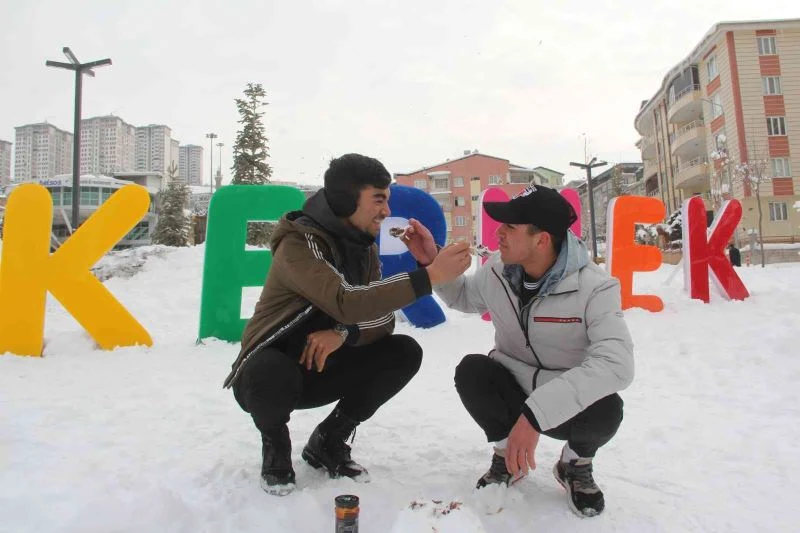Malatya Kernek Meydanında gençler, karlı pekmezin tadına baktı. Evlerinden pekmez getirip karla karıştırıp yiyen gençler, bir yandan da karın tadını çıkardı.