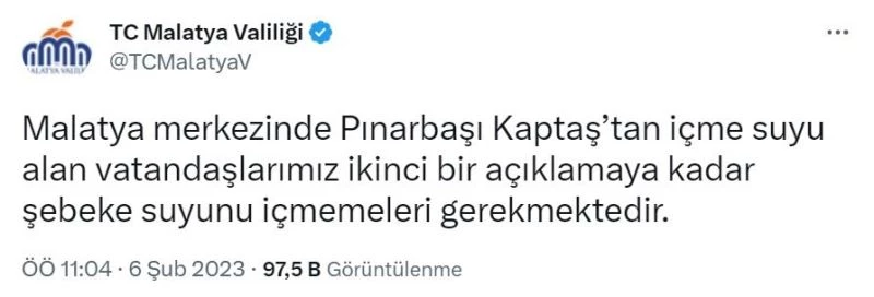 Malatya’da Valiliği tarafından sosyal medya hesabında yapılan açıklamada, “Malatya merkezinde Pınarbaşı Kaptaj’tan içme suyu alan vatandaşlarımız ikinci bir açıklamaya kadar şebeke suyunu içmemeleri gerekmektedir” denildi.