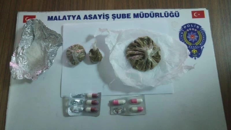 Malatya polis ekiplerince yapılan çalışmalarda yaklaşık 70 gram çeşitli maddelerden oluşan uyuşturucu ele geçirildi.