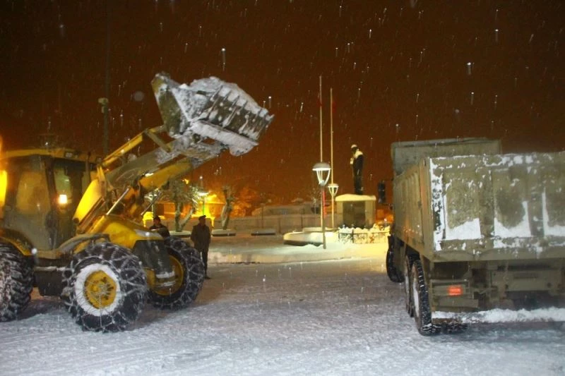Muş’un Malazgirt Belediyesi tarafından çarşı merkezi ve ara sokaklarda başlatılan kar temizleme çalışmaları sabah saatlerine kadar devam etti.