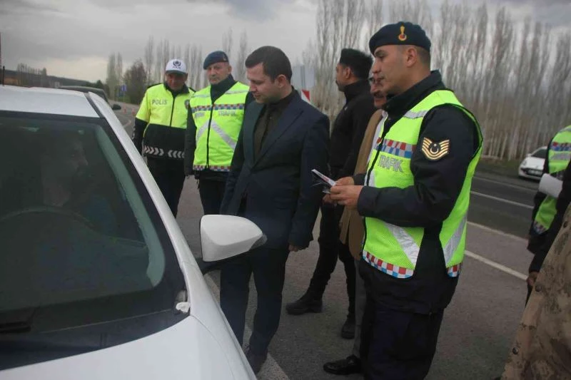 Kaymakam Demirer, emniyet kemeri denetimi sırasında sürücülere kampanya ile ilgili bilgilendirici broşürler dağıttı.