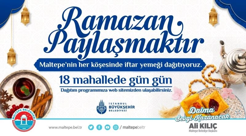 Maltepe Belediyesi, Ramazan ayı boyunca 18 mahallede dayanışma masası kurarak, iftar yemeği dağıtacak. Her gün bir mahallede ücretsiz dağıtılacak, iftar yemekleri 60 bin kişiye ulaştırılacak.