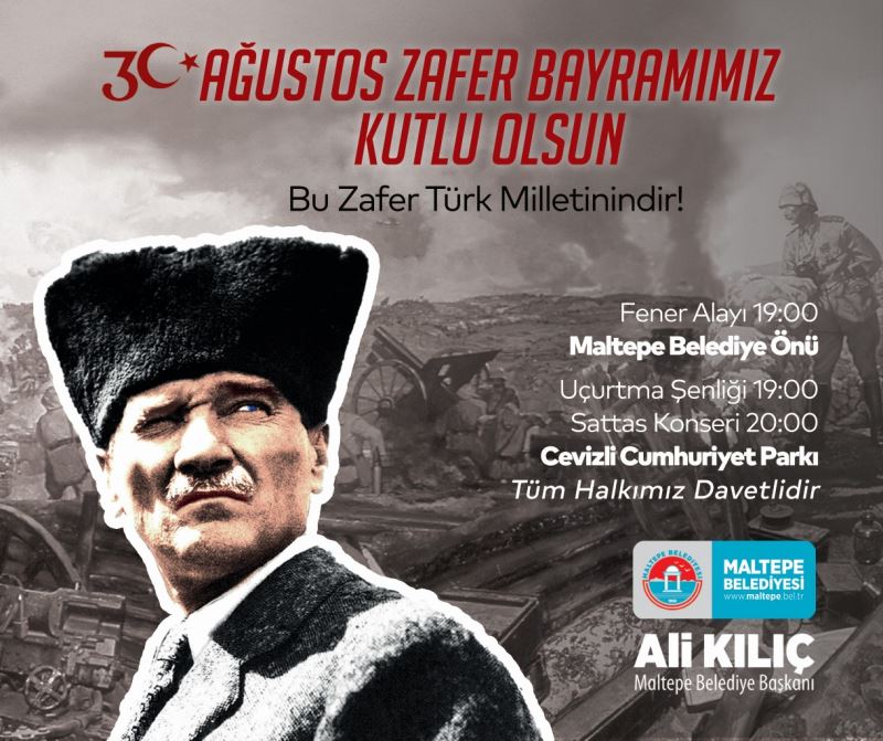 30 Ağustos Zafer Bayramı nedeniyle Maltepe Belediyesi özel etkinlikler düzenliyor. Zafer Bayramı etkinlikleri kapsamında Maltepe Cevizli Cumhuriyet Parkı’nda önce uçurtma şenliği düzenlenecek, ardından ünlü müzik grubu Sattas bir konser verecek. Etkinlikler öncesi Fener Alayı yürüyüşü gerçekleştirilecek. Zafer Bayramı hakkında bir konuşma yapacak olan Maltepe Belediye Başkanı Ali Kılıç daha sonra vatandaşlarla birlikte Fener Alayı yürüyüşüne katılacak.