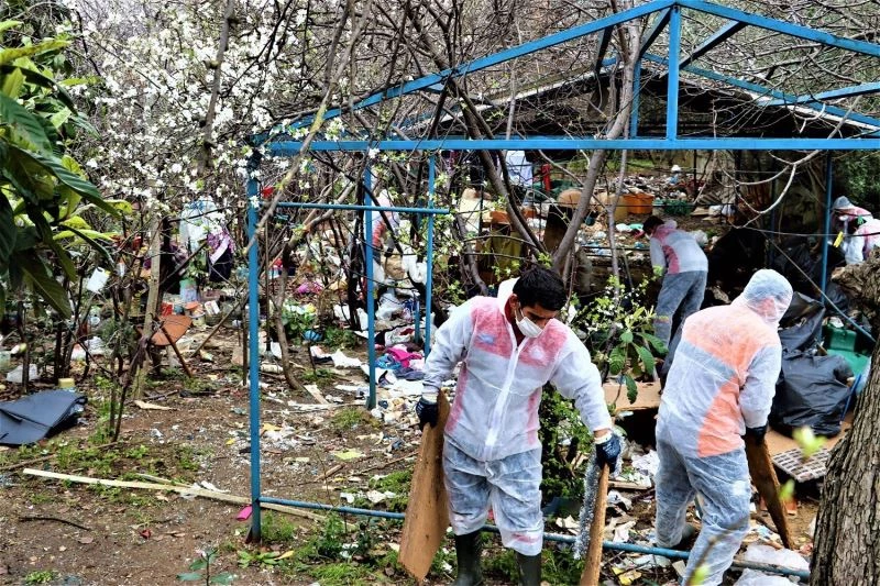Her türlü atık ve çöple dolu ev bahçesi, ekiplerin uzun süreli çalışmasıyla temizlendi. İlgili adresten tam dört kamyon dolusu çöp çıkaran ekipler, daha sonra dezenfekte işlemi gerçekleştirdi.