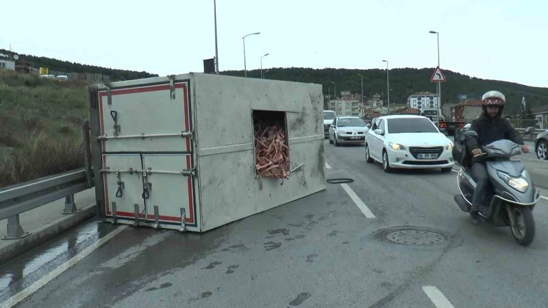 Maltepe’de kemik yüklü kamyonet kaygan zeminde yan yattı