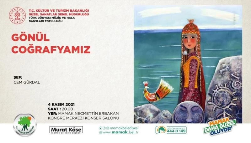Mamak Belediyesi Türk Dünyası’nın farklı coğrafyalarından seçkin eserleri vatandaşlarla buluşturacak. Mamak Belediyesi ve Kültür ve Turizm Bakanlığı Güzel Sanatlar Genel Müdürlüğü’nün birlikte düzenleyeceği "Gönül Coğrafyamız" konserinde Türk Dünyası Müzik ve Halk Dansları Topluluğu birbirinden güzel dans ve şarkılarla davetlilere muhteşem bir gece yaşatacak. Şef Cem Gürdal yönetimindeki konser, 4 Kasım saat 20.00’da Prof. Dr. Necmettin Erbakan Kongre Merkezi’nde gerçekleşecek.