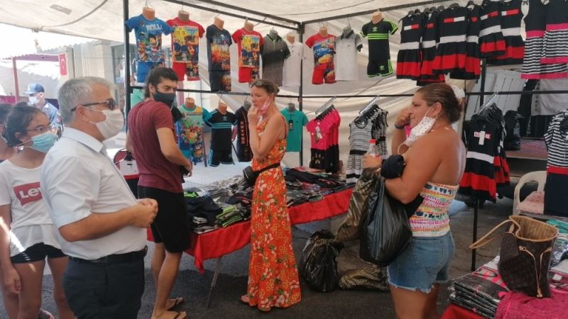 Manavgat Kaymakamı Mustafa Yiğit, korona virüs tedbirleri kapsamında perşembe pazarında denetimlerde bulundu. Pazardaki İngiliz turistlerle sohbet eden Kaymakam Yiğit, maskesi çenesinin altında olan 2 turisti maskeyi düzgün takmaları konusunda uyardı.