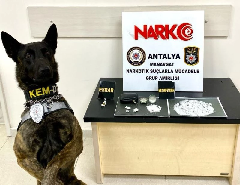 Manavgat Narkotik Suçlarla Mücadele Grup Amirliği görevlilerince Cumhuriyet Savcısının talimatıyla K-9 Narkotik Madde Arama Köpeği Pars’ın da katılımıyla gerçekleştirilen operasyonda M.O. isimli şahsın Side Mahallesinde bulunan ikamet adresinde yapılan aramada; E.O. isimli şahsın üzerinde 0.45 gram esrar maddesi, 0.21 gram metamfetamin maddesi, ikametin mutfağında bulunan ocak üzerinde 2 paket halinde daralı ağırlığı 45,77 gram metamfetamin maddesi, araçta 4 paket halinde daralı ağırlığı 9,35 gram gelen metamfetamin maddesi olmak üzere toplam da 55,33 gram metamfetamin maddesi ele geçirildi. M.O. isimli şahıs hakkında adli işlem başlatıldığı bildirildi.