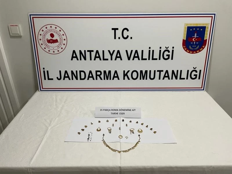 Manavgat İlçe Jandarma Komutanlığı Manavgat Kaçakçılık ve Organize Suçlarla Mücadele (KOM) Timi ve Çolaklı Jandarma Karakol Komutanlığı ekipleri tarafından Manavgat Cumhuriyet Başsavcılığı koordinesinde gerçekleştirilen operasyonla tarihi eser kaçakçılığı yapacağı belirlenen A.Y. ve R.G. isimli şahıslar yakalandı. Yapılan aramada Roma Dönemine ait olduğu değerlendirilen piyasa değeri yaklaşık 10 milyon TL olan; 14 parça altın kalp ve yaprak şeklinde kolye ucu, 3 parça taşlı altın kolye ucu, 2 parça hilal şeklinde altın küpe, 2 parça püsküllü altın küpe, 1 parça altın hızma, 1 parça altın alyans, 1 parça altın çocuk kolyesi ve 11 parça yakut olmak üzere toplamda 35 parça tarihi esere ele geçirildi.