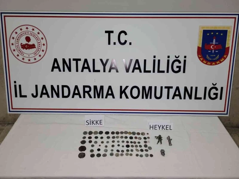 Antalya İl Jandarma Komutanlığı İstihbarat Şube Müdürlüğü, Manavgat ilçesi, Side Mahallesinde T.H. ve C.T. isimli şahısların ellerinde bulundurduğu tarihi eserleri piyasaya sürmeye çalıştığı bilgisini aldı. Alınan bilgi üzerine İstihbarat Şube Müdürlüğü ve Manavgat İlçe Jandarma Komutanlığı ekipleri tarafından şüphelilerin yakalanmasına yönelik düzenlenen operasyonda Roma dönemine ait olduğu değerlendirilen; 79 adet sikke, 3 adet heykel olmak üzere toplam 82 parça tarihi eser ele geçirildi. Tarihi eser kaçakçılığı yapan T.H. ve C.T. isimli şahıslar yakalandı. Olayla ilgili adli işlemler başlatıldı.