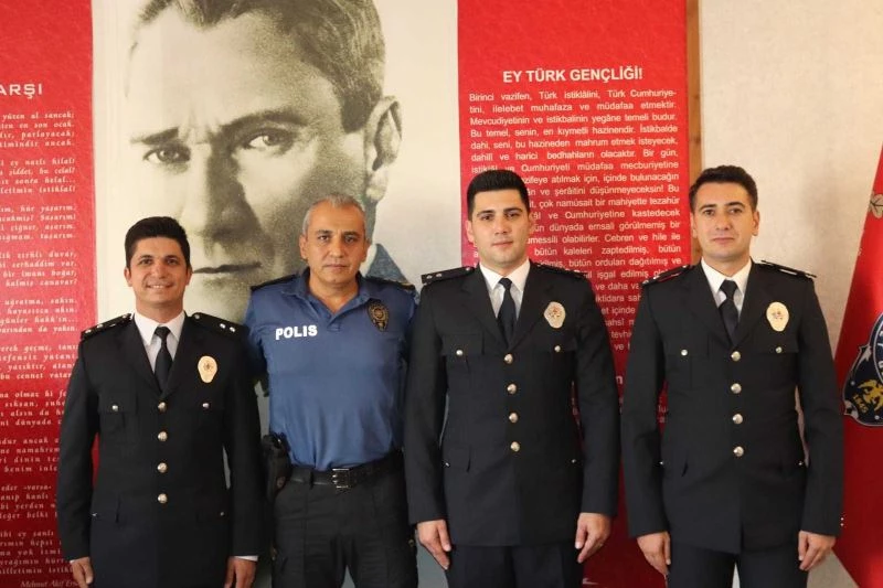 Emniyet Genel Müdürlüğü’nün terfi ve atama kararlarıyla Manavgat ilçe Emniyet Müdürlüğü kadrosunda görev yapan ve komiser yardımcılığından komiser rütbesine terfi eden personel için tören düzenlendi. Manavgat ilçe Emniyet Müdürü Rasim Oymaağaç, Komiser Yardımcılığından Komiser Rütbesine terfi eden, dört personeline yeni rütbelerini makamında yapılan törenle taktı.