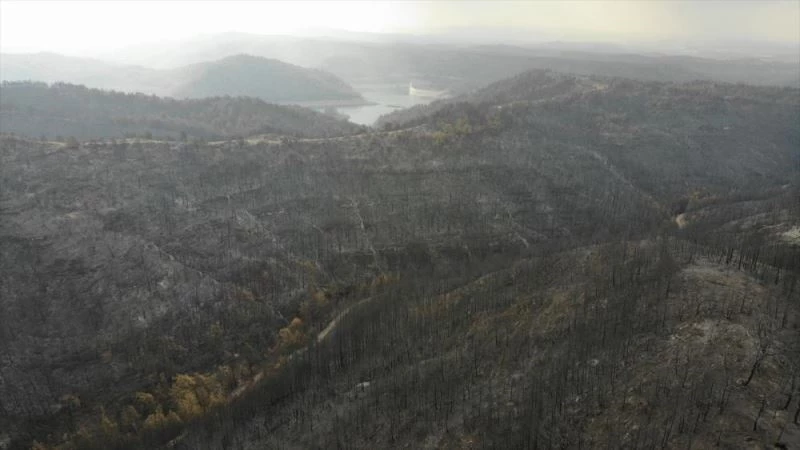 Beydiğin Mahallesi'nde yangında zarar gören alan, havadan görüntülendi.