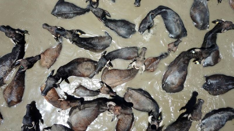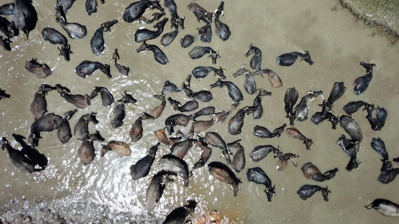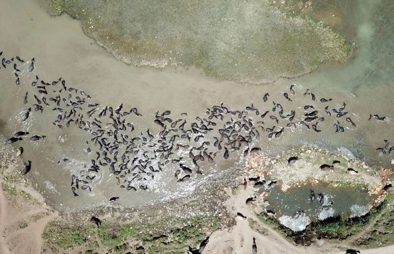 Bitlis’in Güroymak ilçesindeki mandaların meralardan serin sulara tozlu yolculuğu ilginç görüntüler ortaya çıkarıyor.