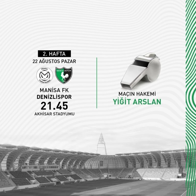 Türkiye Futbol Federasyonu Merkez Hakem Kurulu, 2. hafta maçlarını yönetecek hakemleri açıkladı. 22 Ağustos Pazar günü saat 21.45’de Akhisar Stadyumu’nda oynanacak olan Manisa FK - Denizlispor karşılaşmasını Yiğit Arslan yönetecek. Arslan’ın yardımcılık görevlerini Murat Temel ve Emir Eray Eyisoy üstlenirken, karşılaşmanın 4. hakemi Lütfullah Aslan olacak.